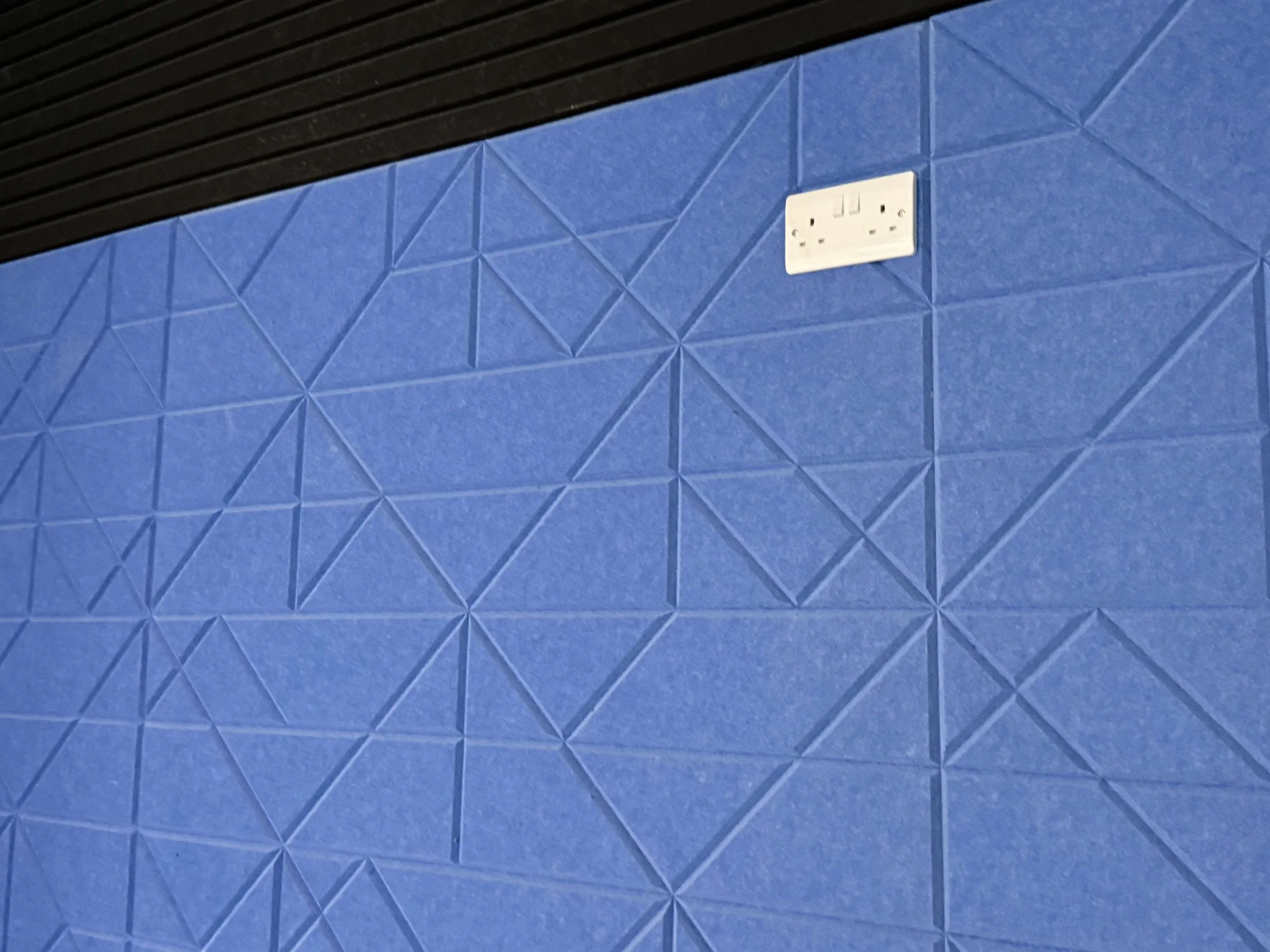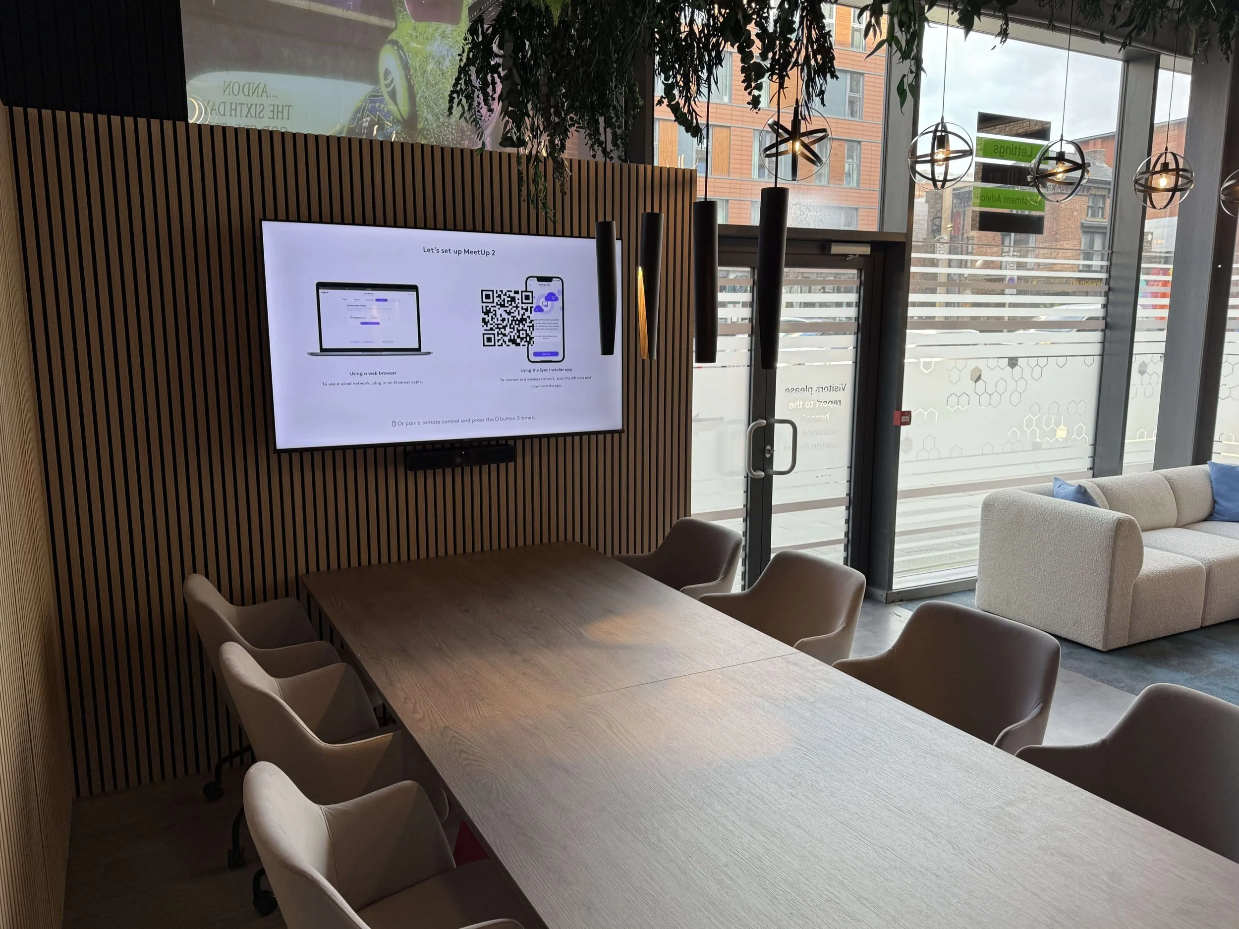 The executive and consultation rooms were acoustically treated using Acoustic PET wall panels, complemented by tasteful slatted wall detailing. For technology, the media suite was built around an iiyama Pro display and a Logitech MeetUp 2 BYOD conferencing setup, with integrated connectivity built into the meeting table for instant plug-and-play presentations.